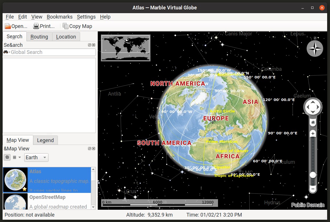 Marble is an open source map viewer, atlas explorer and globe viewer. Developed by the KDE team, Marble allows you to plan routes and it can search for maps from multiple sources. It supports both online and offline maps and you can calculate route estimates using different modes of travel. Marble can be used to view historical maps and it also allows you to view climate conditions like clouds intensity and sun shadows. You can even use it to view maps of Mars, Moon and other planets. Marble uses OpenStreetMap as one of its backends.