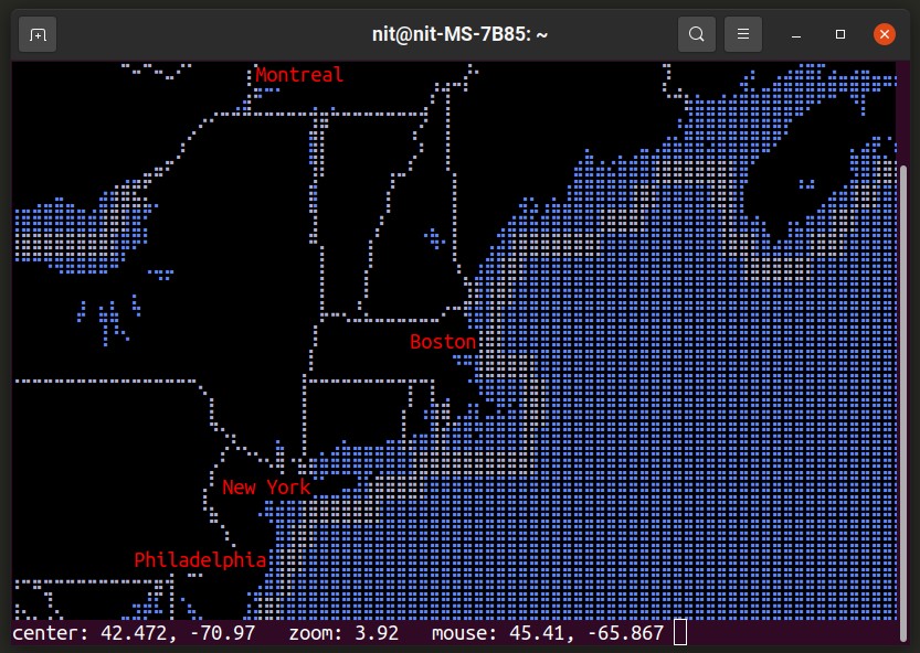 MapSCII can show scrollable maps in ASCII and Braille compatible formats in terminal emulators. You can use keyboard shortcuts and mouse to navigate through MapSCII maps in a terminal, though the experience is not as smooth as browsing maps on a GUI app. It can view both online and offline maps, more information is available on its GitHub page.
