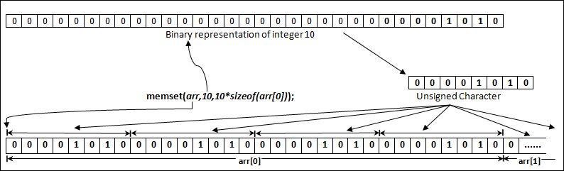 memset() function sets the memory location byte by byte. So, a total of 4 bytes will be: 00001010 00001010 00001010 00001010.