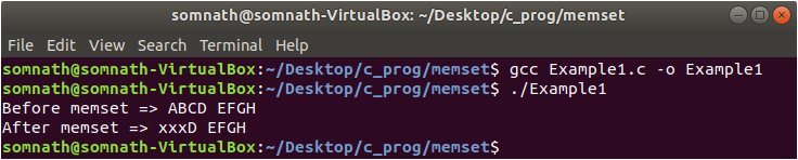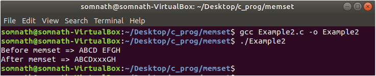 In Example1.c, we have declared one character array of size 30. Then we have initialized it with the string “ABCD EFGH.” In the memset function, we have passed 3 arguments str, ‘x’ and 3. So, the memory block pointed by str will be reset the first 3 characters by ‘x.’ After memset, when we print the memory, we will get “xxxD EFGH.”