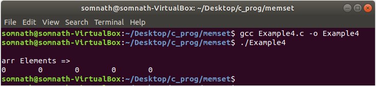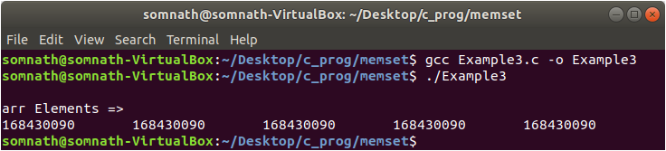 In Example3.c, we have declared an integer array of size 5 and trying to initialize it by 10. But from the output, we have seen that the array is not initialized by 10; instead, we have got the value “168430090”. This is because the integer value is greater than one byte and the memset function converts the value to an unsigned character before copied. Now, we will see how we will get the value “168430090”.