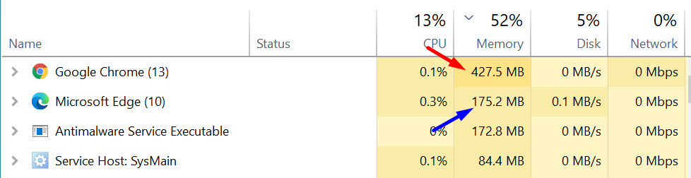With the new version of Edge, Microsoft significantly improved upon performance. Initially, the browser was extremely sluggish and used too much memory to load pages. However, changes were made to its internal structure, and the current version of Edge is very fast. Now, web pages load quickly, even if several tabs are opened. Edge even outperforms Chrome, as it does not slow down if multiple tabs are opened. For example, after opening the same five tabs on both Edge and Chrome, the latter requires much more RAM than the former (as shown in the image below).