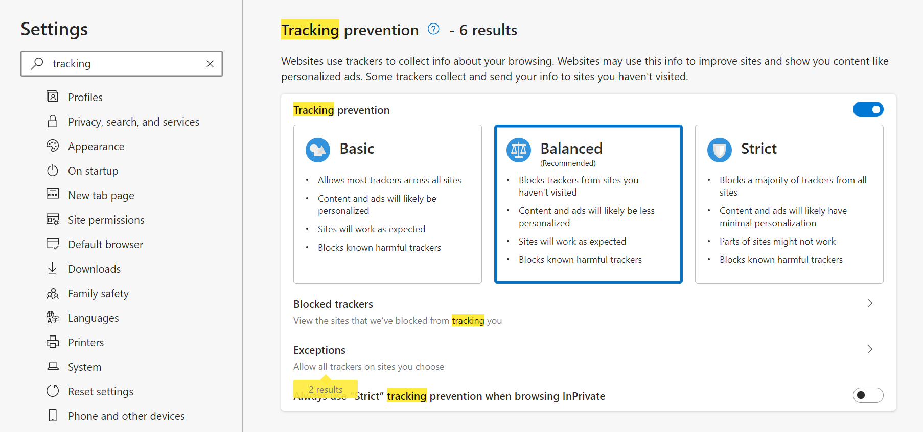 Edge also provides an advanced data security system. Privacy issues have become quite common in recent years, and therefore, it is more important than ever to use applications that protect your data from misuse. Edge provides a tracking prevention feature that gives you control over what you see and prevents third-party websites from tracking you, and it has three categories users can adjust in accordance to their needs.