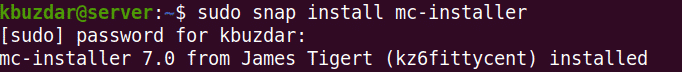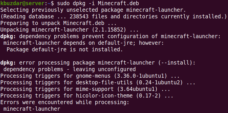 The next step will be to install the Minecraft downloaded package. Issue the following command in the Terminal to do so: