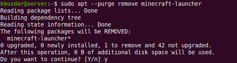 After running the above command, the system might ask for confirmation that if you want to continue the removal process or not. Press y to continue; after that, the Minecraft will be removed from your system.