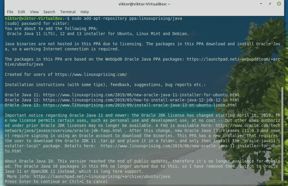 Thanks to the developers of Linux Uprising, there’s now a dedicated PPA that offers all the latest versions of Oracle Java. At the time of writing this article, Java 13 is the latest version of Oracle release.