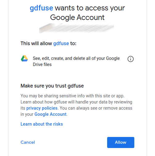 Now, it’s time to mount Google Drive. Create a directory and tell google-drive-ocamlfuse to mount your Google Drive there.