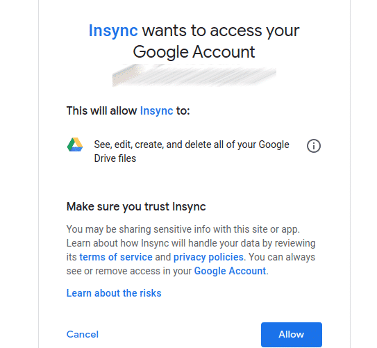 Click “Allow” to grant access to your Google Drive to Insync.