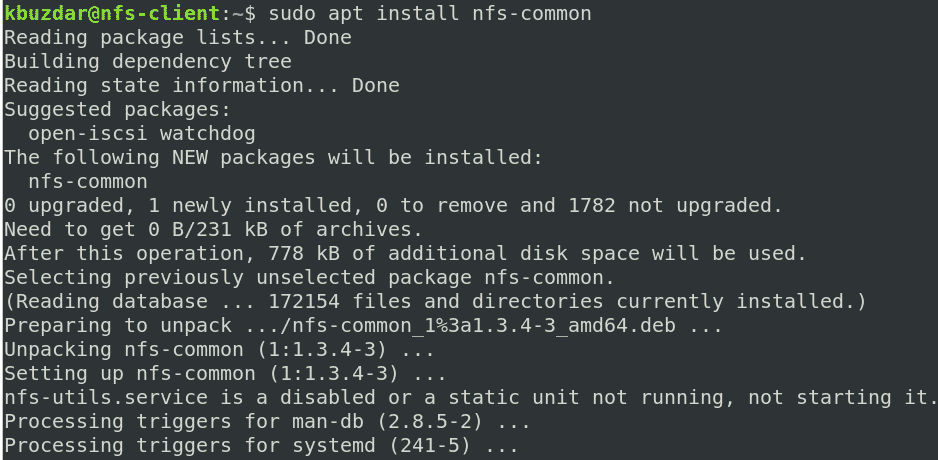 To mount share directories on the client machine, you must first install the NFS client package on it. On the client machine, run the following commands in the Terminal to install the NFS client package: