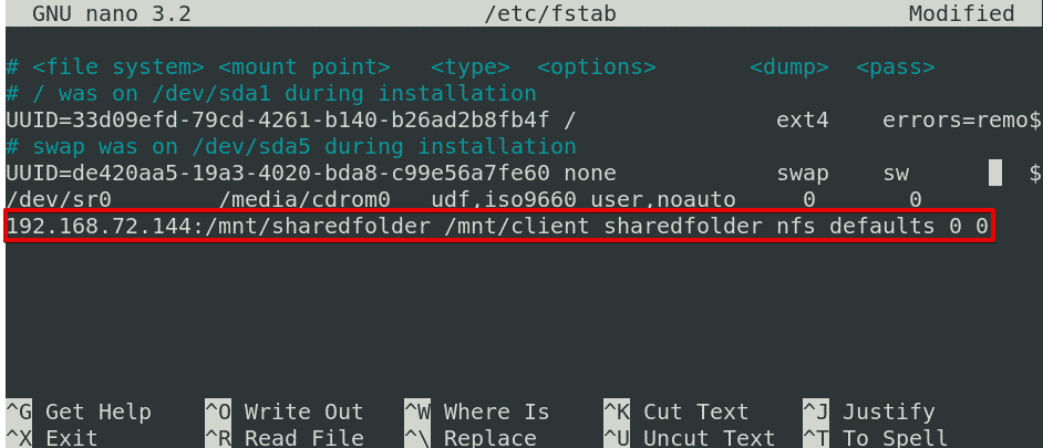 After adding the above entry in the /etc/fstab file, save and exit the file by Ctrl + o and Ctrl + x, respectively.