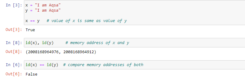 The integrated id() method contains an object’s id as just an integer. That integer normally refers to the storage position of the object. The ‘is’ operator relates the identities of two objects to each other. The integrated function, type(), returns the kind of an object. Compare two variables ‘x’ and ‘y’, having the same value, using equality operator ‘x == y’, it will output True. Using the id() function, we have compared the memory addresses of both variables, it will output False because both variables are different and located at different memory locations, although the values they contain are the same.