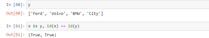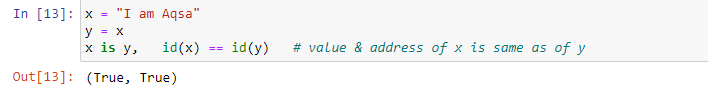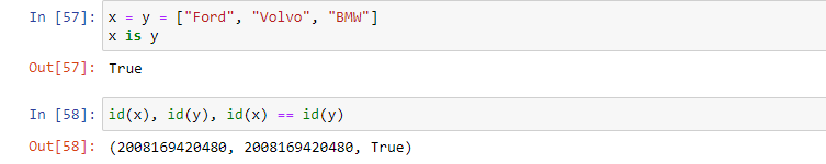 Make another variable ‘z’ which points to the identical entity that ‘x’ is directing to, using assignment operator ‘=’. Using the ‘is’ operator we have found that they both, point to the same object and have the same memory addresses.