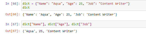 As dictionaries are commonly used variables in Python, let’s have a look at the mutability of dictionaries. We have defined a dictionary named ‘dict’ with three keys and their values. When we print it out, it will display all contents of it. You can print each dictionary value separately, as well as using their keys instead of indexes.