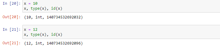 Let’s define a variable ‘x’ having a value ‘10’. A built-in id() method is used to find out the location of ‘x’ in memory and type() is used to identify its type. When we try to change the value of ‘x’, it is successfully changed, although the memory address returns differently. It is because we haven’t actually changed the value of ‘x’, but we have created another object with the same name ‘x’ and assign it a different value. We have bonded the name ‘x’ to the new value. Now, whenever you call ‘x’ it will output the new value.