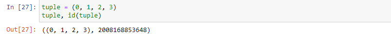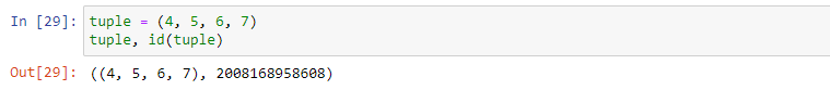 Have a glimpse of a tuple type variable, we have defined a tuple with 4 values. We have used the id() function to output its address. When we want to change its value at 0 indexes, it gives the TypeError that tuple doesn’t support item assignment or update.