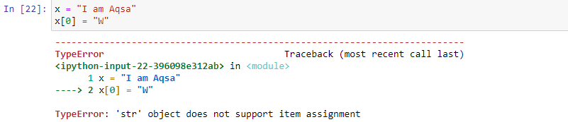Same for the string data type, we cannot modify the existing variable but we have to create a new one with the same name. Here we have defined a string variable ‘x’ and want to add ‘w’ to its zero indexes. It will output TypeError, showing that the string object doesn’t support update.