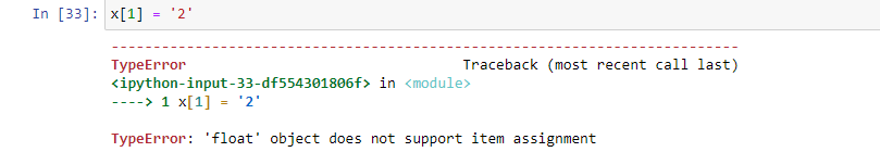 We have a float type variable ‘x’. Using the id() function, we have to find out its address. When we want to change its value at index 1, it gives the TypeError that float doesn’t support item modification.