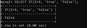 To gain knowledge about the If statement, we have first to test the IF() function. In the below example, we have defined the IF() function in the SELECT query and give it a condition to check whether 2 is greater than 9 or not. If the condition is valid, it will return the first value after the condition; otherwise, second. As our condition is not valid, that’s why it returns ‘false’.