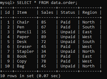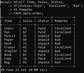 Let’s have a look at the IF() function performed on this table. We have been selecting the three columns. If the column ‘Status’ has the value ‘Paid’ then the IF() method will return ‘Excellent’ otherwise ‘Bad’. The IF() function’s returned value will be saved into a newly run-time-created column ‘Remarks’. Now we can see the output as appended below.