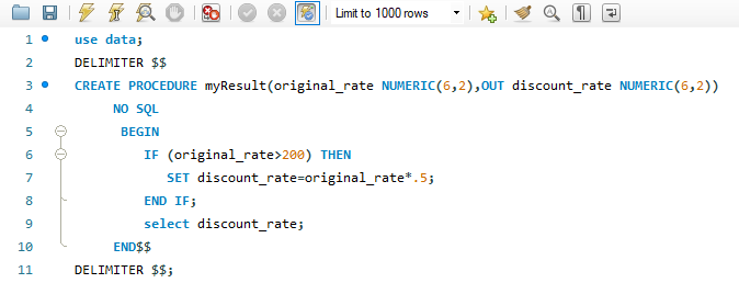 We have been working on the database ‘data’; then, you have to state the ‘use data’ command to use it in Workbench. Press the flash icon to execute it. You have to know that the If-then statements work with store procedures, as shown below. We have declared a keyword delimiter to start the store procedure. The procedure ‘myResult’ has been taking two arguments. After the BEGIN statement, we have an IF statement that is checking the condition. If the condition satisfies, then the ‘THEN’ command and its following statement will be executed. If the condition gets false, then the statements after ‘END IF’ will be implemented.