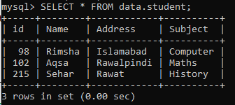 First of all, you have to use the database ‘data’ to use the table ‘student’ in our store procedure. For that, type the below command in your MySQL command-line terminal.