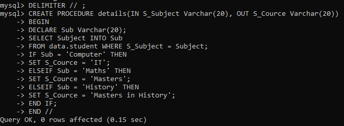 Now declare a delimiter, and then start writing the store procedure. The ‘CREATE’ command will be used to declare or create a procedure as always. The procedure ‘details’ has been taking two arguments. After that, the store procedure starts with the ‘BEGIN’ keyword. The word ‘DECLARE’ has been used to define a variable ‘Sub’ for subjects. The ‘SELECT’ query has been used to select the values of column ‘Subject’ from the table ‘student’ and save it into the newly declared variable ‘Sub’. The user-provided value ‘S_Subject’ will be compared to the column ‘Subject’ value. In the ‘IF’ statement, If the user-provided value ‘S_Subject’ matches with the column ‘Subject’ value, then the relative ‘THEN’ statement will be executed along with its statements within. This procedure will be processed from the first ‘IF’ statement to the second, then the third ‘ELSEIF’ statement. If the last ‘ELSEIF’ part doesn’t match with the value provided by a user, then control will be given to the ‘END IF’ statement.