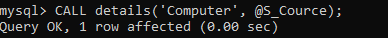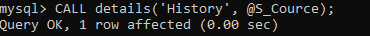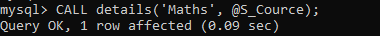 We have to call the store procedure by executing it with a ‘CALL’ query and provided arguments in the parenthesis. As we have given ‘Maths’ as its value, then a new column will be generated to output the ‘THEN’ and ‘SET’ statement.