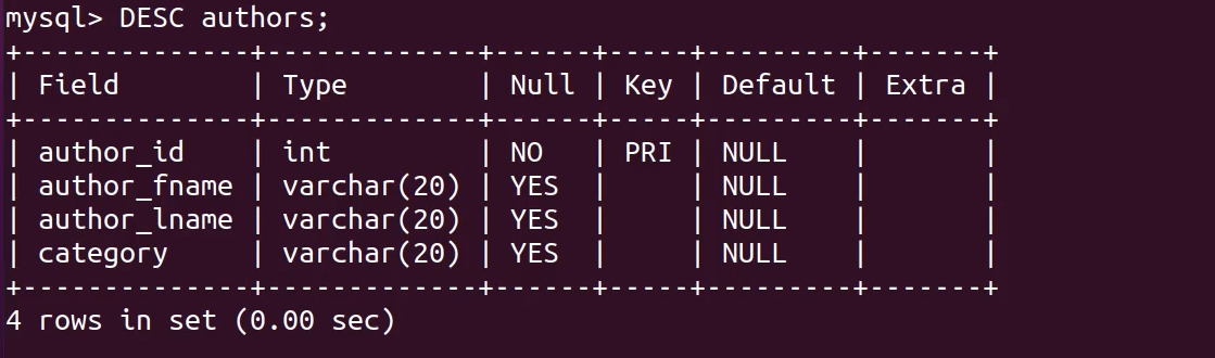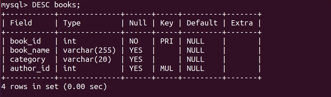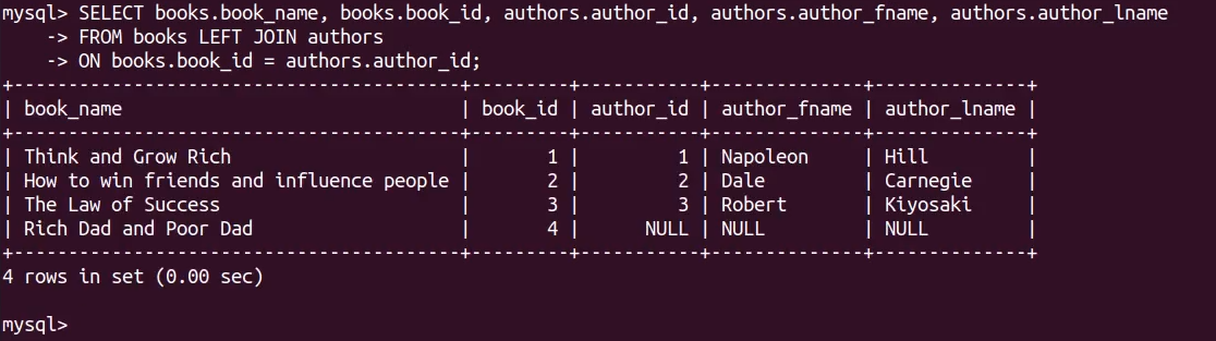 As you can see, we have the rows from both of the tables where the books table ID is equal to the author’s table ID. In the last row, we can also see that there is no ID number 4 in the author’s table, so it has returned NULL against it.