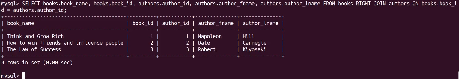As you can see, we have the rows from both of the tables where the author’s ID is equal to the book’s ID. We know that there was a fourth book in the books table, although we didn’t get it, this is because of the RIGHT JOIN.