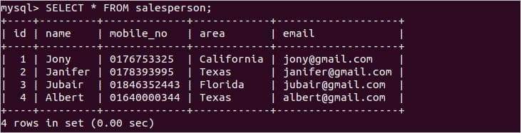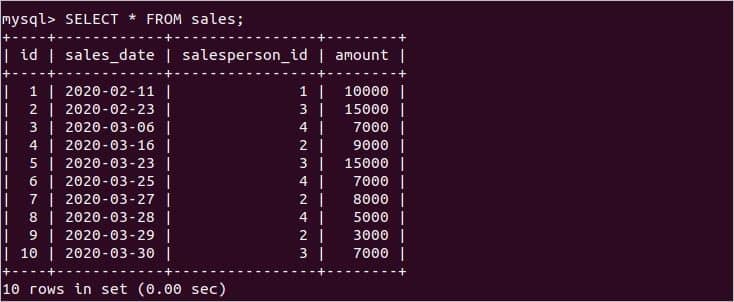 Now, run the following statements to check the records of both salesperson and sales tables.