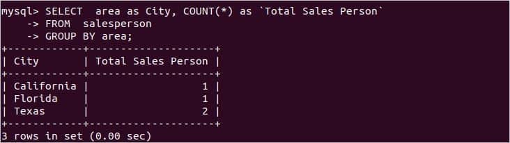 salesperson table contains area wise salesperson information. If you want to know the total number of the salesperson in each area the following SQL statement can be used. It will count the total number of salesperson from salesperson table group by area.