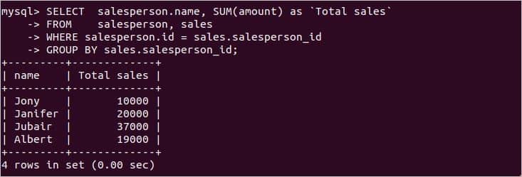 The following output will appear after running the above statement. There are four salespersons in salesperson table and the output shows the total sales amount for each salesperson.