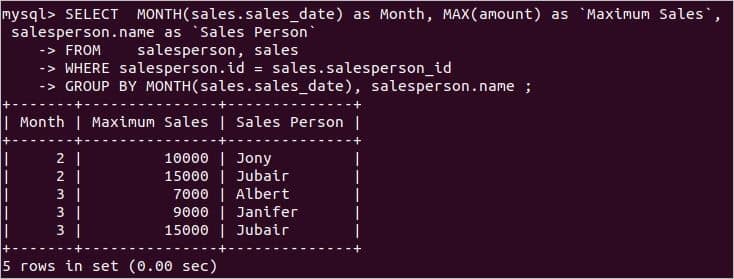 When it is required to find out the monthly maximum sales based on each salesperson then the following SQL statement can be used to get the output. Here, MONTH() function is used to identify each month and MAX() function is used to find out the maximum amount value of each month from sales table.