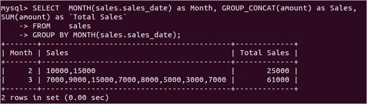 When it will require to find out the total sales amount based on each month by mentioning each unique sales amount of each month then the following SQL statement can be used. Here, MONTH() function is used to read monthly sales amount values based on the sales_date and GROUP_CONCAT() function is used to count the monthly sales amount.