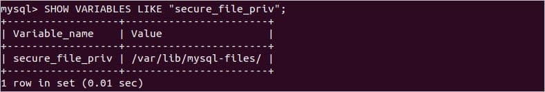 Every exported file stores in a particular location in MySQL and the location is stored in the variable, “secure_file_priv“. Run the following command to find out the path of the file. This is a read-only variable that you can’t change.