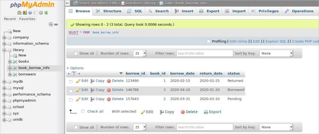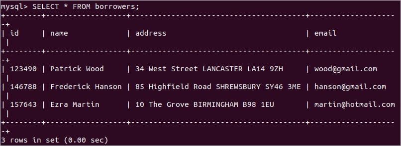 The table data can be exported into a CSV file by using mysql client. The borrowers table is exported in this part of this article. Run the following command to check the existing content of this table.