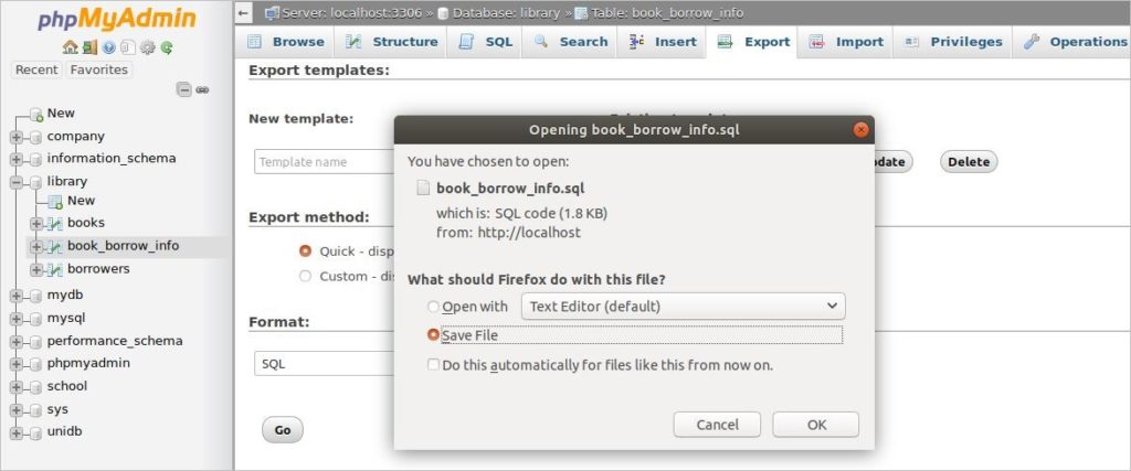 Select the table of the database that you want to export and click on the Export tab from the right side. Select the CSV format from the Format drop-down list and click on the Go button. Select the Save File option and press the OK button.