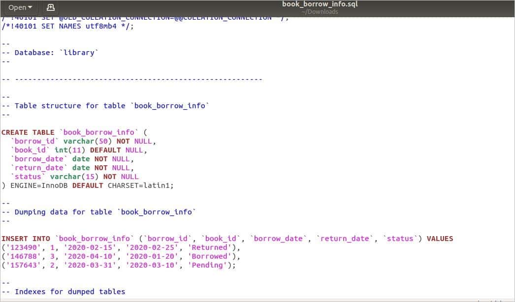 The file will be downloaded in the Downloads folder. Here, book_borrow_info table is exported. So, the CSV filename will be book_borrow_info.csv and the following content will appear if you open the file.