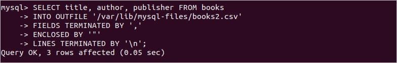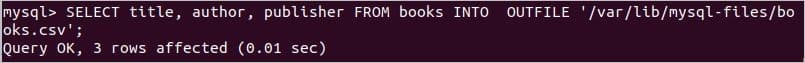 Any filename with .csv extension can be set for the export filename. Run the following export command to create books.csv file in the location,/var/lib/mysql-files/.