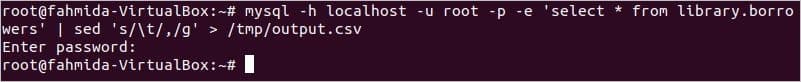 mysql statement with `sed` command is used here to export the data. One of the benefits of this statement is that you can set any location and filename for storing the CSV file without the default location that is used in the previous example. If there is no password for the root user then -p option will be omitted. The exported location is /tmp and filename is output.csv here.