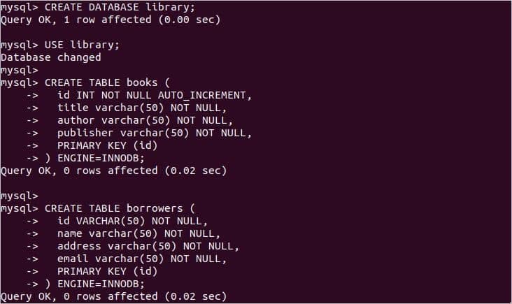 Before creating a foreign key constraint, you have to create a database and parent table with the primary key. Suppose the database name is ‘library’ and it contains two parent tables named ‘books’ and ‘borrower’. Make a connection with MySQL server using the mysql client and run the following SQL statements to create the database and the tables.