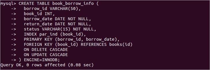 Create a table named ‘book_borrow_info‘ with foreign key constraints by executing the following statement. Here, the book_id field is a foreign key for this table and every value of this field must exist in the id field of books table. books is the parent table and book_borrow_info is the child table. Two restrictions are also set with the foreign key here. These are DELETE CASCADE and UPDATE CASCADE. That means if any primary key will remove or update from the parent table then the corresponding records related to child table related to the foreign key will be removed or the foreign key will be updated.