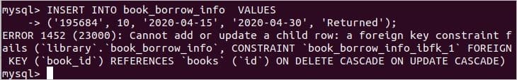 If you try to insert a value in the foreign key field of the child table that does not exist in the primary key field of the parent table then MySQL will generate an error. The following SQL statement will generate an error because the parent table, books doesn’t contain any id value 10.