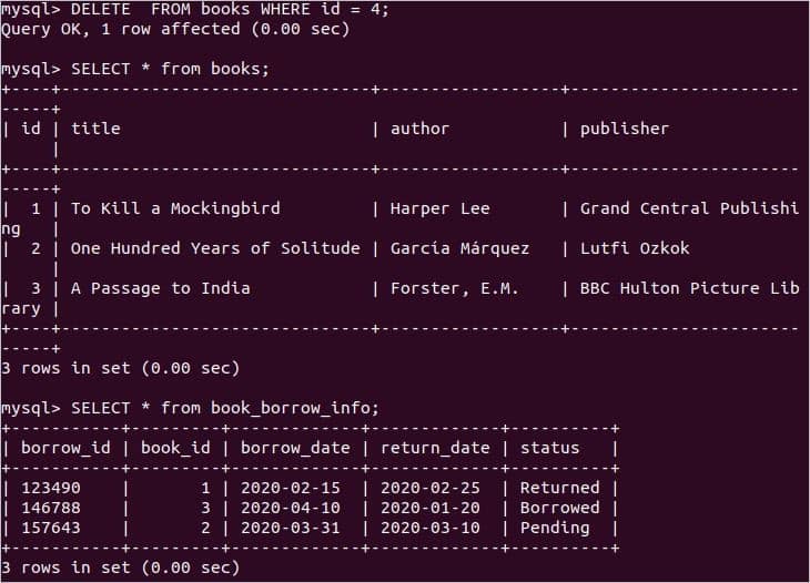 After executing the following DELETE statement, when the fourth record will be removed from the books table then the related records from the book_borrow_info table will be removed automatically for the foreign key constraint.
