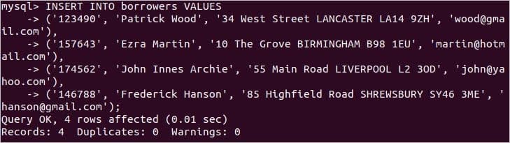 At first, insert some records into borrowers table and this table will be defined as parent table in the next ALTER statement.