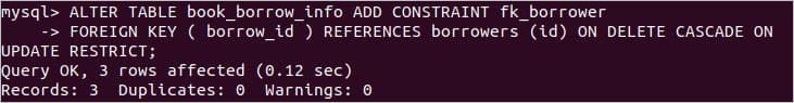 Run the following ALTER statement to set another foreign key constraint for book_borrow_info table to make the relationship with borrowers table. Here, borrow_id is defined as a foreign key for book_borrow_info table.