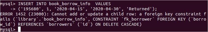 The following INSERT statement will generate an error message because the id value 195680 does not exist in borrowers table.