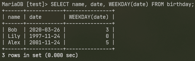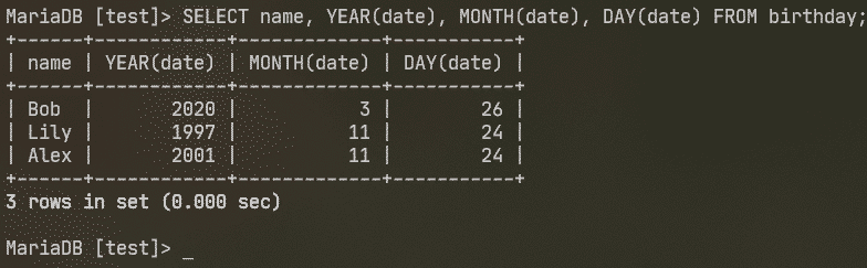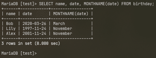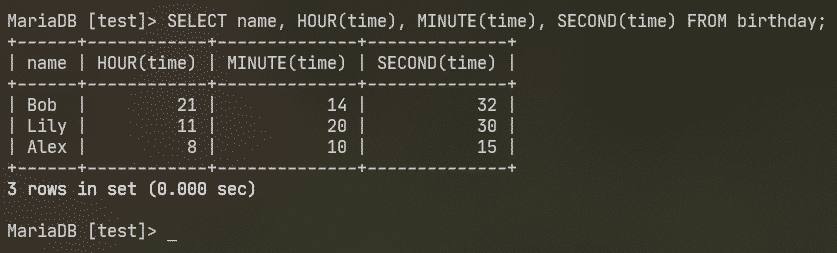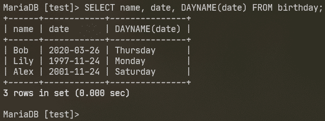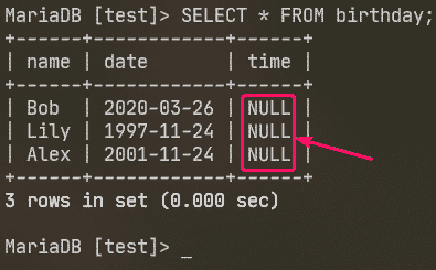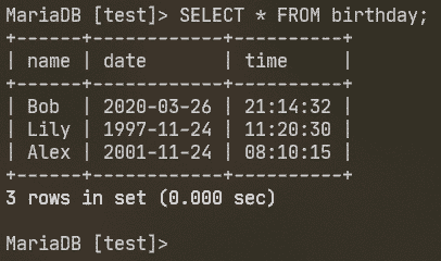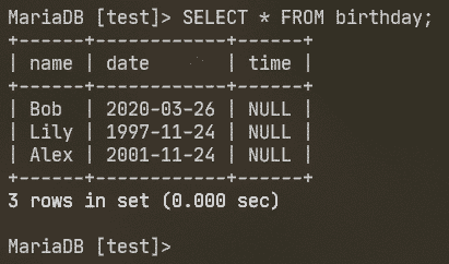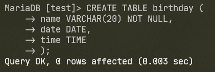 I will use a birthday table for demonstrating how to work with DATE and TIME data types in this article. The birthday table has a name field of type VARCHAR, a date field of type DATE and a time field of type TIME.