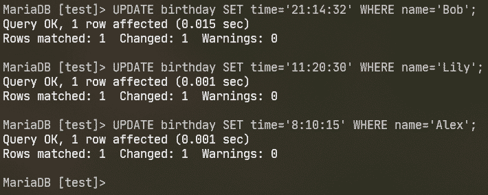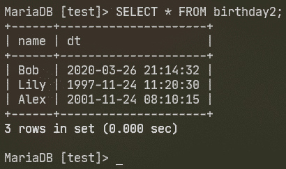 Earlier, I’ve stored the date and time in different fields of the birthday table. That’s impractical. If you need to store the date and time information, you should use the DATETIME data type.