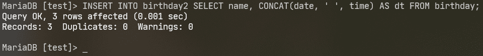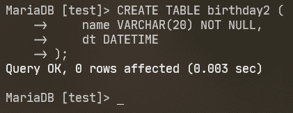 You can create a new birthday table birthday2 that uses the DATETIME data type as follows: